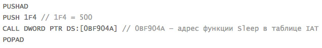 Напишем саму задержку. Придется вспомнить ассемблер. Для начала надо, как и перед вызовом любой функции, сохранить все регистры в стек при помощи команды PUSHAD. Затем нужно поместить в стек все параметры функции. В нашем случае параметр один — задержка в миллисекундах. Пусть она будет равна 500. После этого нужно вызвать функцию и вернуть регистры из стека командой POPAD.