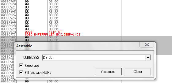 Олли внедрил команду JMP и забил оставшееся место нулями. Теперь отправимся по нашему адресу и перенесем туда сохраненные команды. Для этого выделяем область, нажимаем пробел и вводим команды по очереди аналогично тому, как мы вводили JMP.