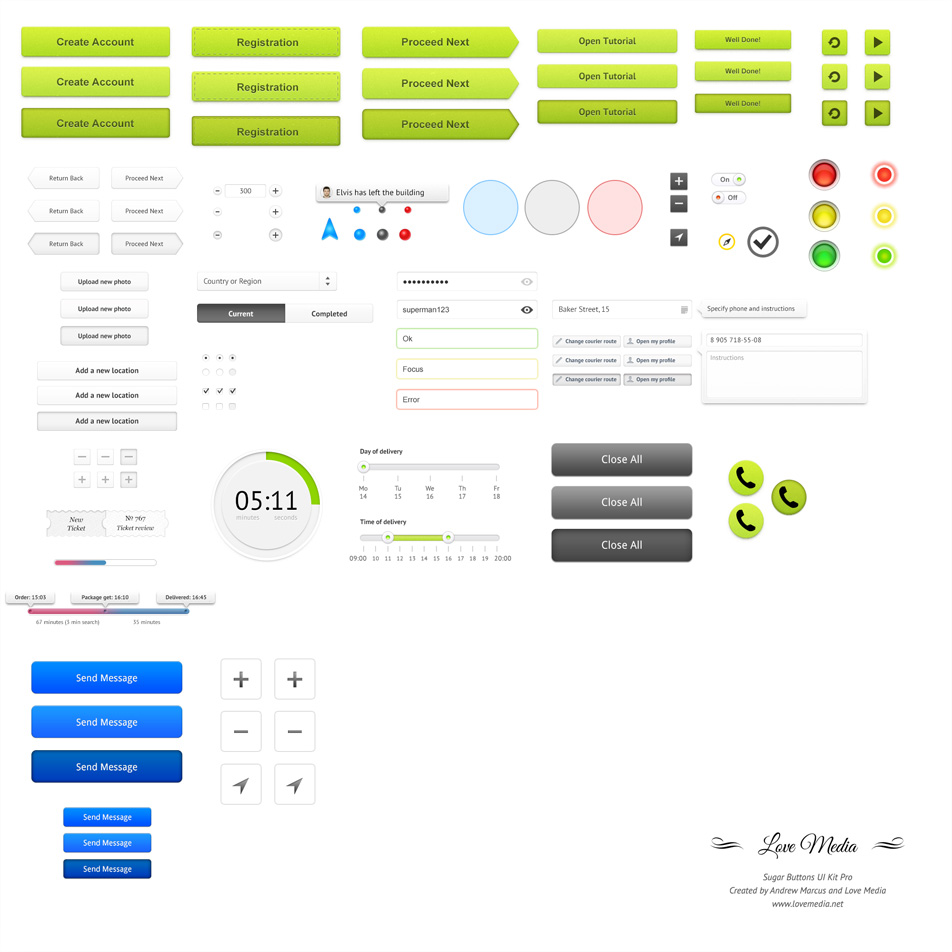 A set of "Sugar Buttons" includes a whole mountain of different buttons, switches, tabs, checkmarks, sliders and so on. All you need to create an interface.
