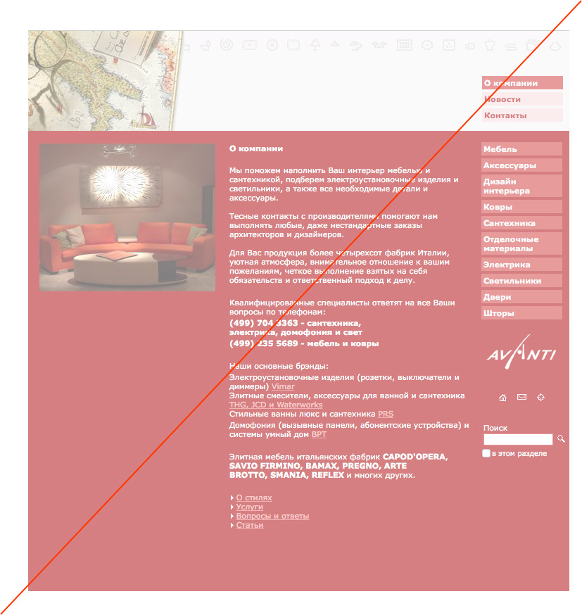 Avanti is a major supplier of expensive sanitary ware, furniture, decoration materials and interior items. The company exists since 1990, and about the same time there is its site.