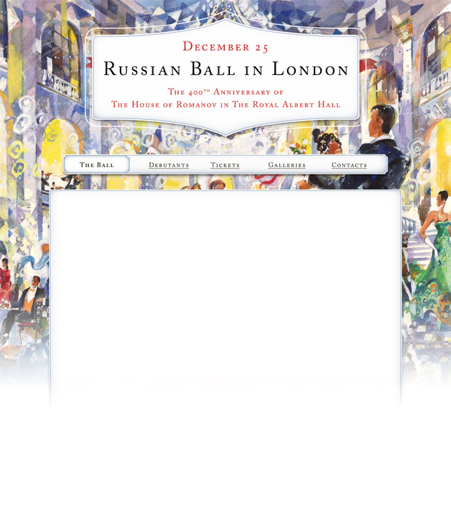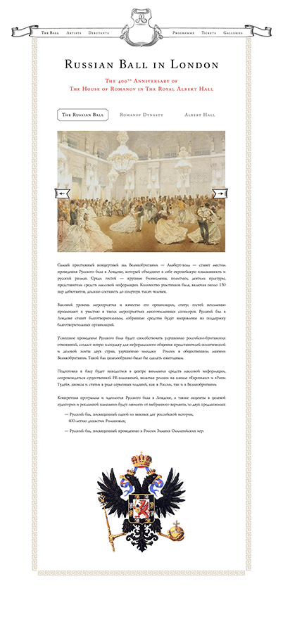 Каждая без исключения страница сайта нарисована и оформлена уникально. При создании страниц не использовалась единая сетка. Можно сказать, что сайт Русского бала в Лондоне — полностью ручной работы.